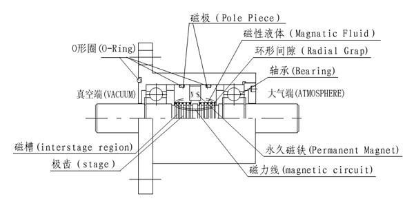 • 磁流體密封原理:磁流體密封技術(shù)就是利用磁流體對磁場的良好響應(yīng)特性而實(shí)現(xiàn)的。當(dāng)把磁流體注入到由高性能的磁鐵,導(dǎo)磁良好的極靴與旋轉(zhuǎn)軸所構(gòu)成的磁回路間隙中,在磁場的作用下,磁流體在間隙中形成數(shù)個(gè)液態(tài)的“O”形圈,從而起到密封作用。